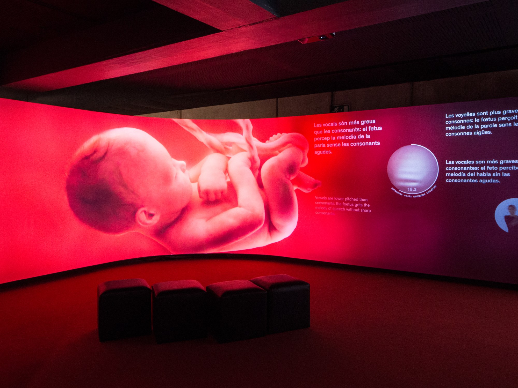 En la instalación de Talking Brains dedicada a la adquisición del lenguaje puedes entrar en un útero materno para escuchar los sonidos que se perciben desde allí. Entre los latidos del corazón, la respiración y los sonidos digestivos de la madre, lógicamente también se aprecia su voz, filtrada por la grasa y el tejido muscular, pero aun así, reconocible. Siéntate y disfruta de esta experiencia inmersiva.